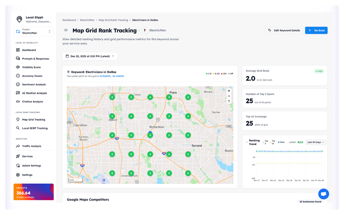 Track position in Google's Local Pack and Map results across different locations and grid points.