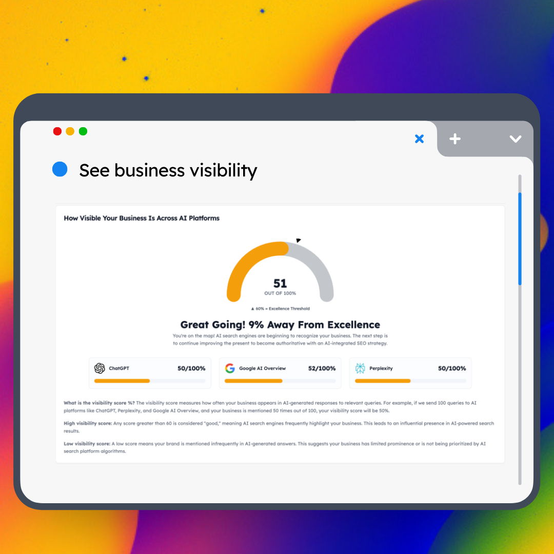 AI search optimization ensures local businesses appear accurately and prominently when people ask AI platforms like ChatGPT, Perplexity, and Google AI Overview questions about services in their area. We monitor how these platforms represent businesses and help improve visibility and fix any misrepresentations.